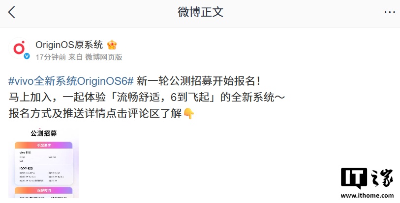 IT之家 1 月 22 日消息,全新 OriginOS 6 系统今日官宣开启新一轮公测招募报名,覆盖 vivo S20、iQOO Neo8 系列等机型。