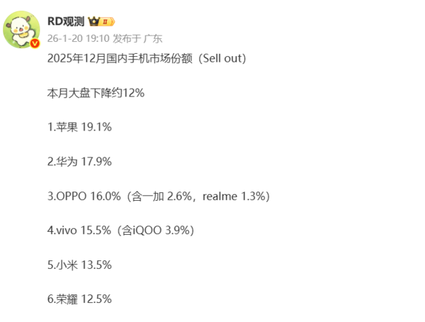【CNMO科技消息】近日,博主“RD观测”曝光了2025年12月国内手机市场份额。数据显示,12月大盘销量(Sell out)环比下降约12%,苹果以19.1%的份额位居第一,紧随其后的是华为(17.9%),OPPO(16.0%,含一加和realme)、vivo(15.5%,含iQOO)、小米(13.5%)和荣耀(12.5%)分列第三至第六位。