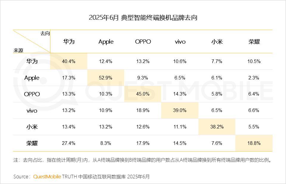 在QuestMobile于2025年6月发布一份统计中可以看到,vivo用户持续支持的比例为39%,低于华为、苹果和OPPO,并不是一个很高的比例。在发生影响用户体验的风波后,这一数据有可能进一步降低。
