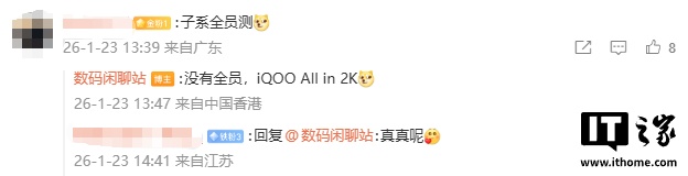 IT之家 1 月 23 日消息,博主 @数码闲聊站 今日爆料称,天马和京东方都在测试 1.5K+240Hz 超高刷直屏。评论区有网友猜测“子系全员测”,该博主回复称:“没有全员,iQOO All in 2K”。