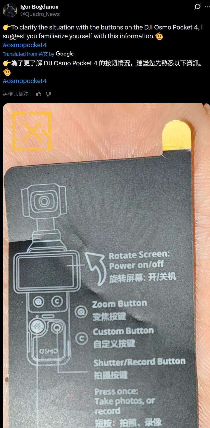 根据他分享的照片我们可以看到,Osmo Pocket 4 的外观与前代产品 Pocket 3 几乎没有明显变化,整体仍延续大疆的经典造型,上方配备一枚单摄,下方则是一个可旋转屏幕,屏幕下方的转轴则配有多枚实体按键,其中一枚是变焦按键,另一枚则是自定义 C 键。