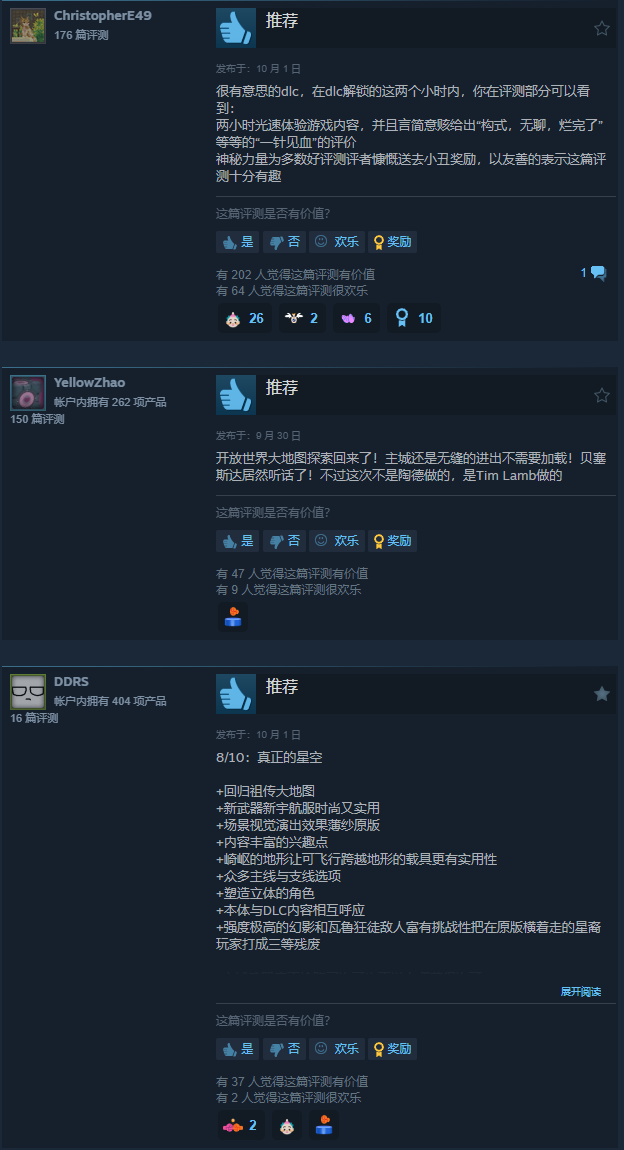 “不推荐”玩家则认为该 DLC“延续了本体的制作水准,也就是毫无起伏情绪调动基本没有的剧情”,还有玩家写道:“他没有扩展任何玩法,没有改进任何体验,就是一张手工制作的大地图,它更应该作为游戏本体的内容出现而非单独的 DLC”。