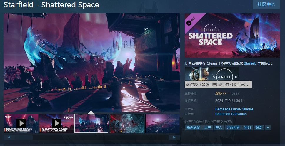 IT之家 10 月 1 日消息,B 社《星空》首个 DLC“破碎空间”(Shattered Space)于北京时间 9 月 30 日晚 11 点解锁发售,这款 DLC 在 Steam 平台国区售价为 116 元,支持简体中文界面和字幕。
