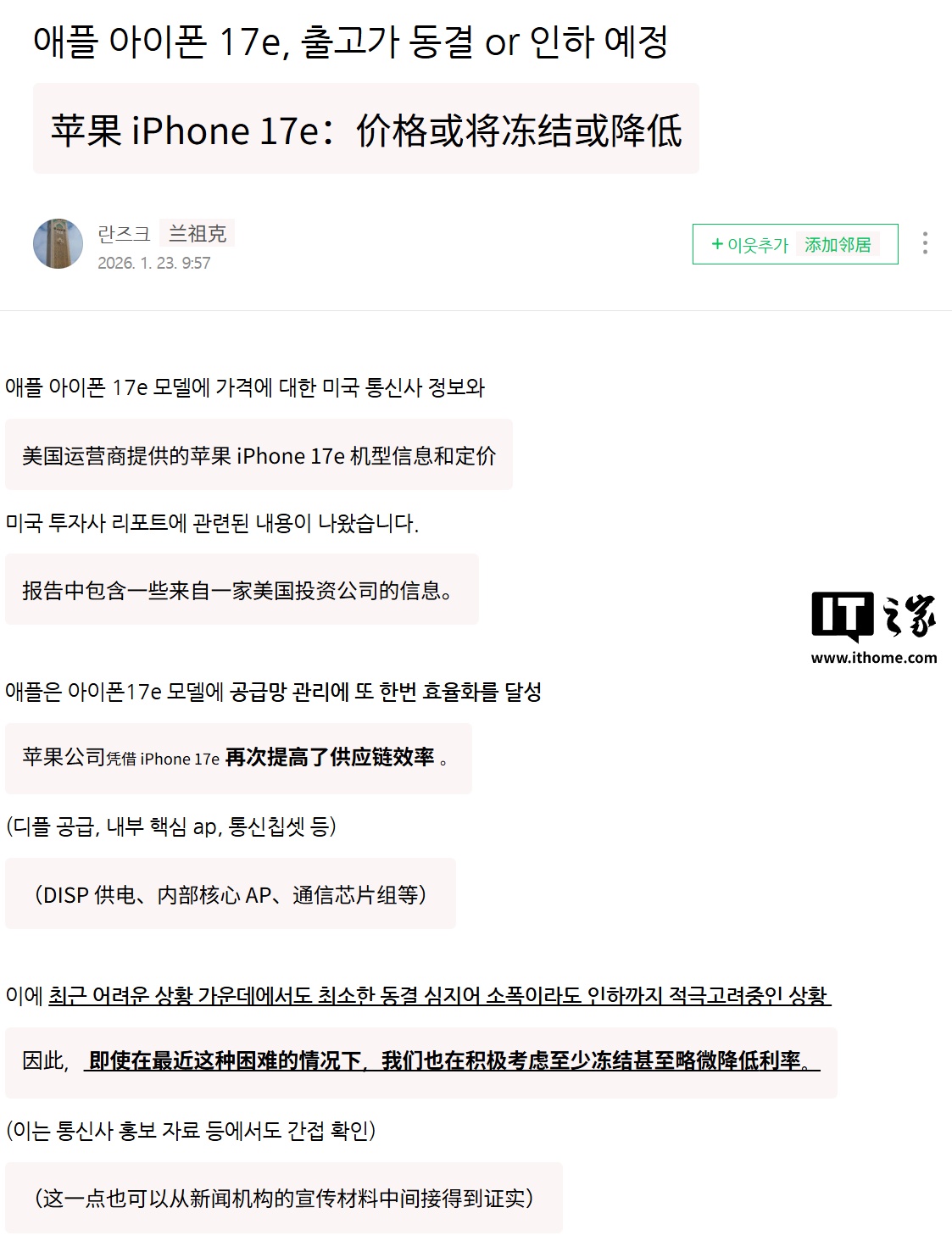 IT之家 1 月 24 日消息,消息源 yeux1122 昨日(1 月 23 日)发布博文,爆料称尽管 NAND 闪存和 DRAM 内存成本飙升导致高端机型面临涨价压力,但 iPhone 17e 售价不仅有望与 iPhone 16e 持平(国行售价 4499 元起),甚至可能出现下调。