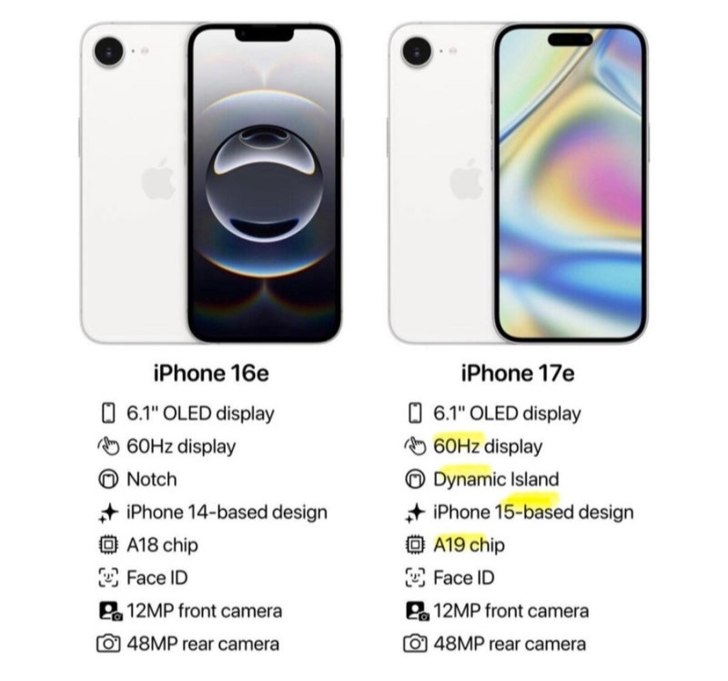 在外观设计上,iPhone 17e 将由前代的“刘海屏”转变为“灵动岛”设计。性能方面,iPhone 17e 预计将搭载与标准版 iPhone 17 同款的 A19 芯片;面板方面,苹果将采用 LTPS OLED 面板,而非高端机型上昂贵的 LTPO 面板。