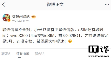 微博博主 @数码闲聊站 对此表示,小米 17 没有卫星通信版,但后续将提供 eSIM 支持;vivo X300 Ultra 同样支持 eSIM,虽然具体发布日期未定,但确认会在今年第一季度内发布。