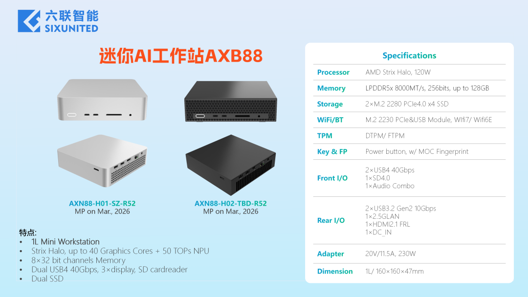 IT之家 1 月 24 日消息,六联智能 (SIXUNITED) 昨日在一篇文章中表示该企业已推出并即将在 3 月量产基于 AMD "Strix Halo" 处理器平台的 1.2L 超紧凑迷你工作站 AXB88。