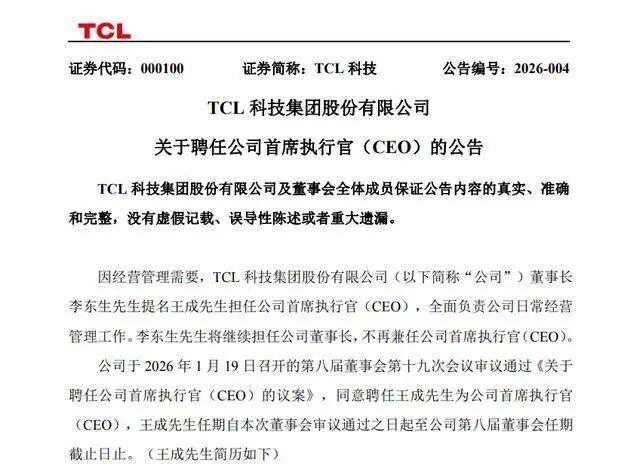 就在索尼与TCL签署合作意向备忘录的同时,TCL科技集团发布了一则人事变动公告:创始人李东生卸任CEO职务,仅保留董事长一职,由70后“老将”王成接任CEO。
