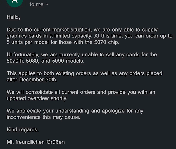 还有网友称,自己收到了零售商的一份通知,称显卡库存有限,RTX 5070 Ti、5080、5090完全没货,RTX 5070也只能限购5块。