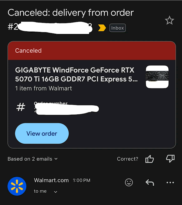 技嘉的RTX 5070 Ti WindForce也类似,网友下单后收到通知说推迟发货,然后第二天订单直接就被取消了,再看价格已经贵了200美元。
