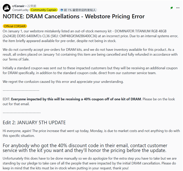 比如海盗船48GB DDR5内存,网友以240美元下单后却被取消,理由是标价错误,随即引发口诛笔伐。