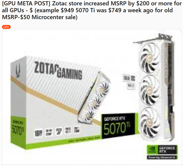 海外论坛Reddit上有多位网友曝料,索泰、技嘉等品牌的显卡都出现了突然大幅涨价的情况。