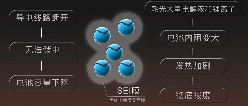 更麻烦的是,硅表面有层保护电池的 SEI 膜(固体电解质界面膜),会跟着硅的反复胀裂不断修补增厚,这过程耗光大量电解液和锂离子,不仅电池内阻变大、发热加剧,用不了多久就彻底歇菜了。