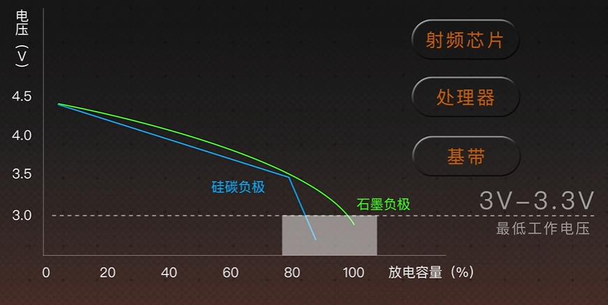硅碳负极材料虽然理论比容量高,但其放电电压平台显著低于传统石墨负极,在放电的后半程,硅碳电池的端电压下降速度较快,然而,手机内部的射频芯片、处理器和基带等元器件,都有一个固定的最低工作电压,通常在 3V 到 3.3V 之间 。