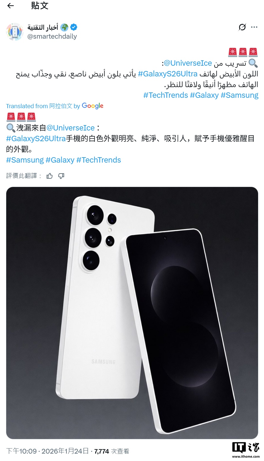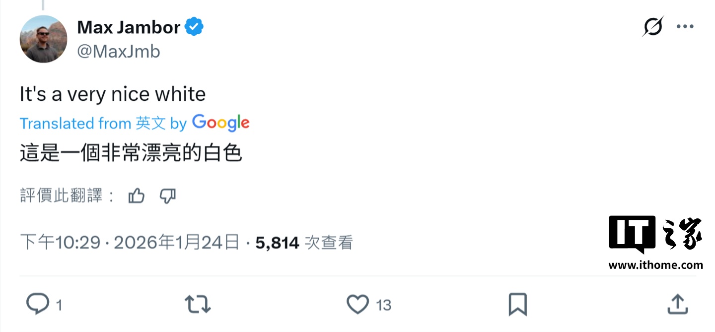 IT之家 1 月 26 日消息,消息人士@UniverseIce 前天在 X 平台透露,三星 Galaxy S26 Ultra 手机将拥有纯白色版本,“非常迷人”。随后另一位爆料人 Max Jambor 也认同了他的说法,并认为该机的白色配色“非常漂亮”。