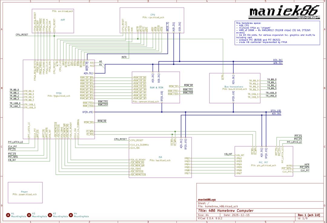 最近,Maniek86 用了不到 6 个月时间,从原理图画起,自己设计印刷电路板(PCB)、实现芯片组逻辑,硬生生从零做出了一块完整可用的 Intel 486 架构主板。