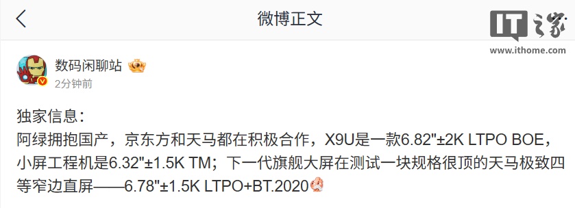 IT之家 1 月 27 日消息,博主 @数码闲聊站 今日爆料,阿绿拥抱国产,京东方和天马都在积极合作。