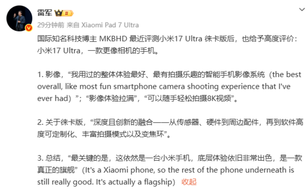 【CNMO科技消息】1月27日,小米集团创始人雷军在社交媒体上分享了国际知名科技博主MKBHD在测试了小米17 Ultra后,称其为“我用过的整体体验最好、最有拍摄乐趣的智能手机影像系统”,特别强调这款产品“更像相机的手机”。
