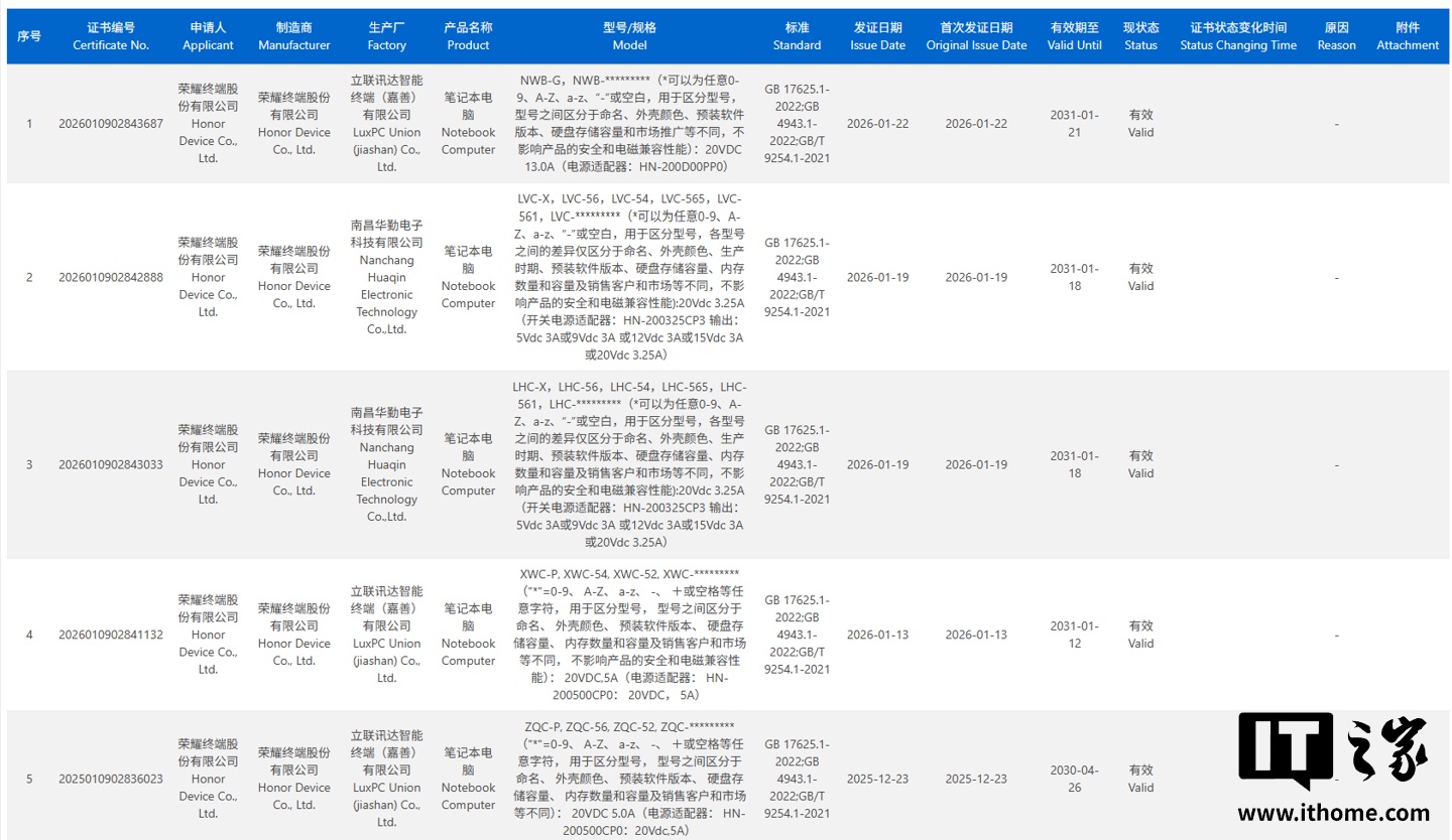 IT之家 1 月 27 日消息,博主 @旺仔百事通 今日表示,今年是荣耀笔记本产品大年,多款笔记本陆续通过 3C 质量认证。轻薄全能向和性能向的笔记本都有,多个品类开花,年后陆续见。