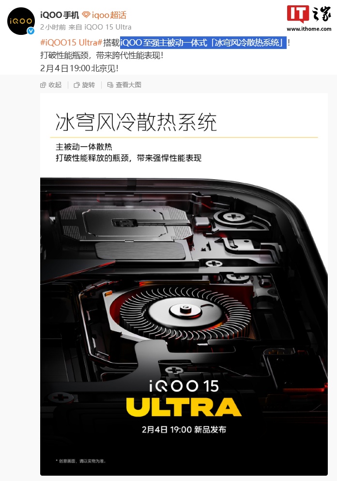另外,iQOO 15 Ultra 还搭载 iQOO 主被动一体式「冰穹风冷散热系统」,包括内置散热风扇等。