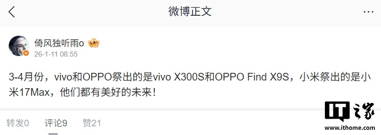 IT之家注意到,微博博主 @倚风独听雨 曾在本月中提到,一批国产新机将于今年 3-4 月集中发布,包括 vivo X300s、OPPO Find X9s、小米 17 Max 等,值得期待。