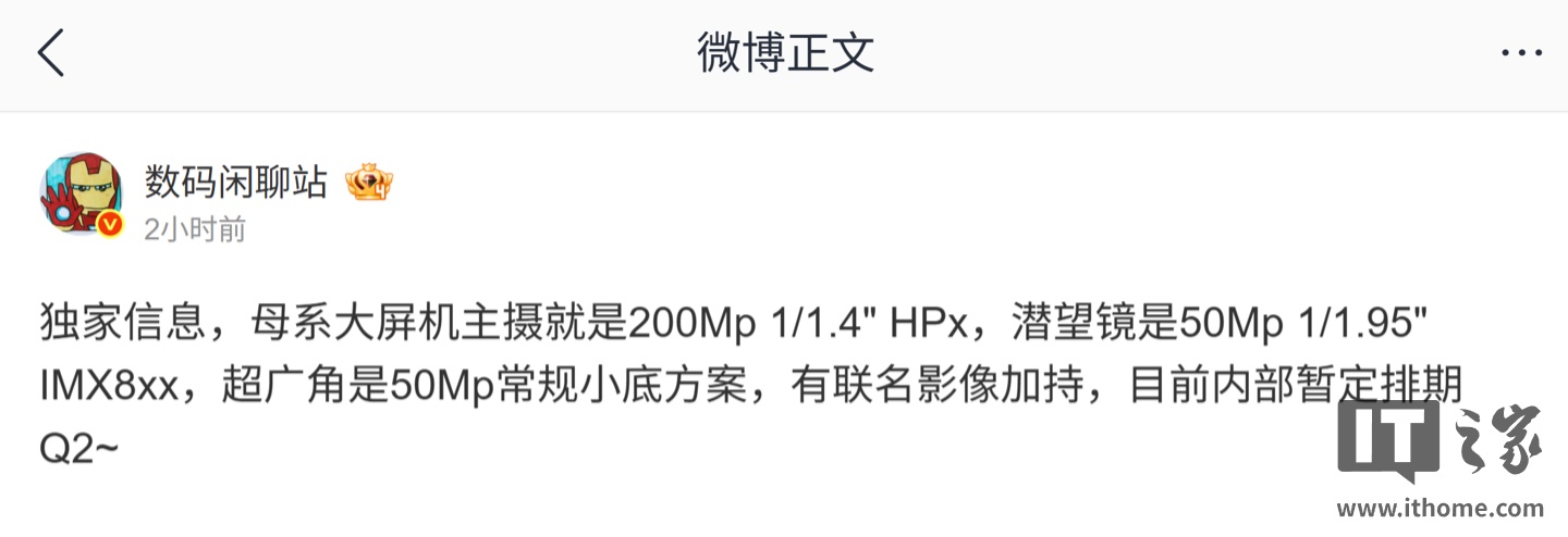 IT之家 1 月 27 日消息,博主 @数码闲聊站 今天在微博透露,某厂的母系大屏机将搭载 2 亿像素 1/1.4 英寸三星 HPx 主摄。
