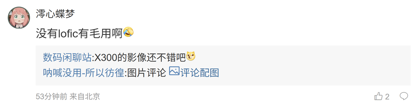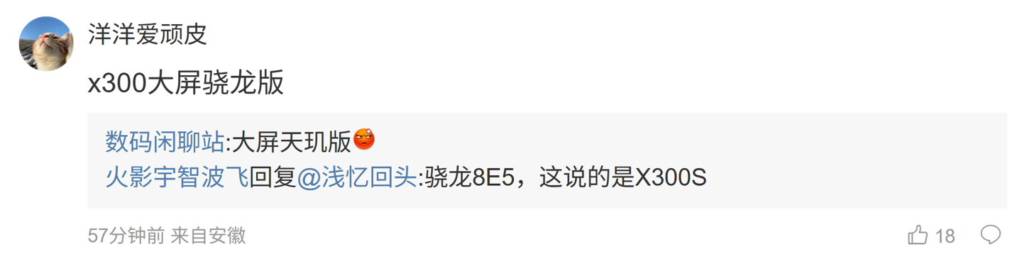 后续有用户在评论区表示:“x300 大屏骁龙版”,博主回复道:“大屏天玑版”;另一名用户则表示:“没有 lofic 有毛用啊”,博主则回复道:“X300 的影像还不错吧”。