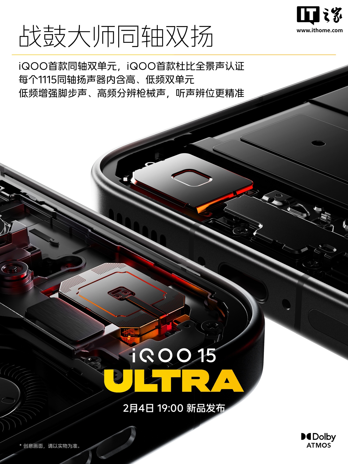 IT之家 1 月 28 日消息,iQOO 手机官方今日介绍了 15 Ultra 在游戏体验方面的配置。新机将 iQOO 首发「战鼓大师同轴双扬」+ iQOO 首款「杜比全景声」认证。简单来说,iQOO 15 Ultra 配备同轴双单元扬声器(1115E 同轴),支持听声辨位。