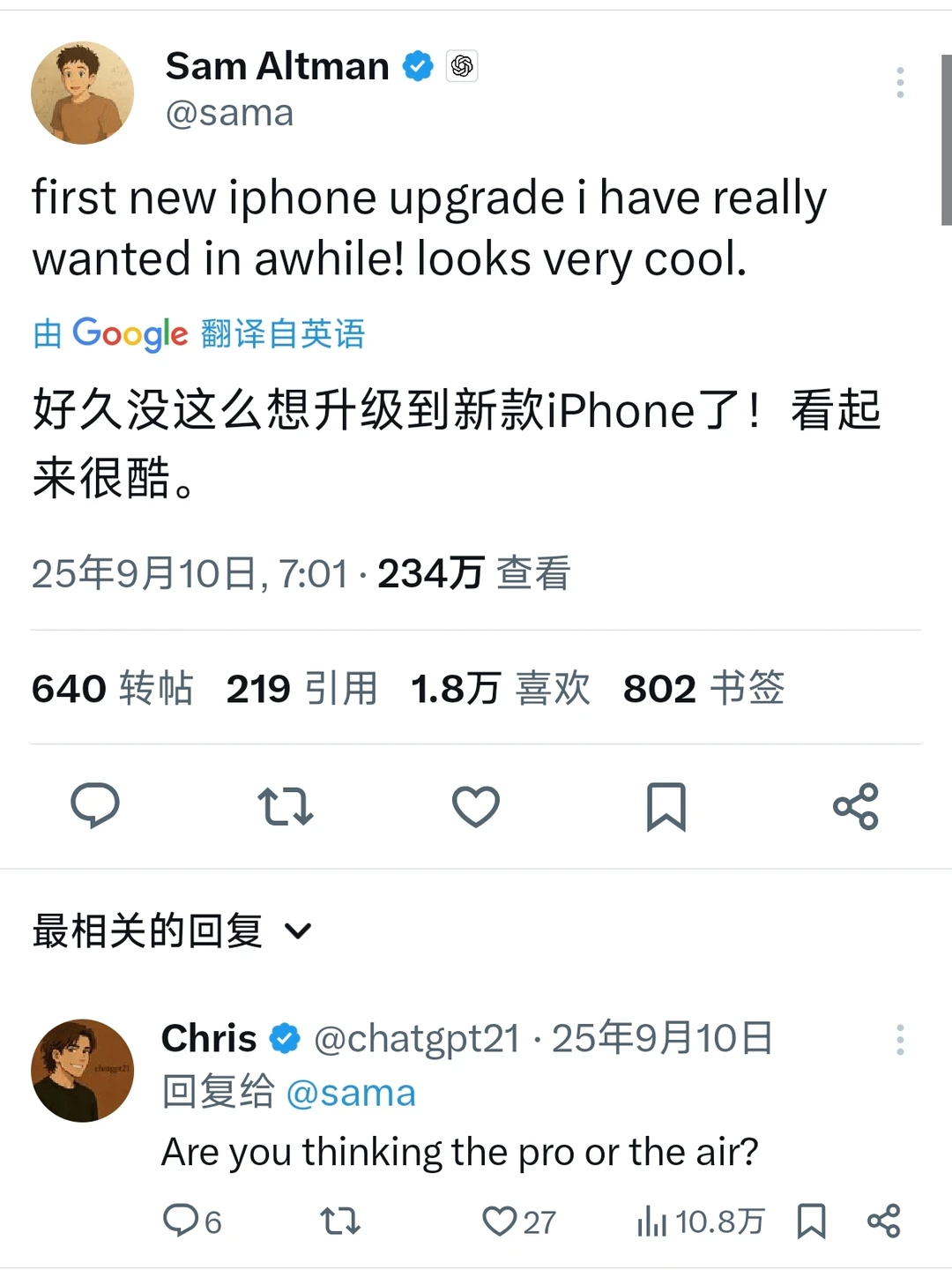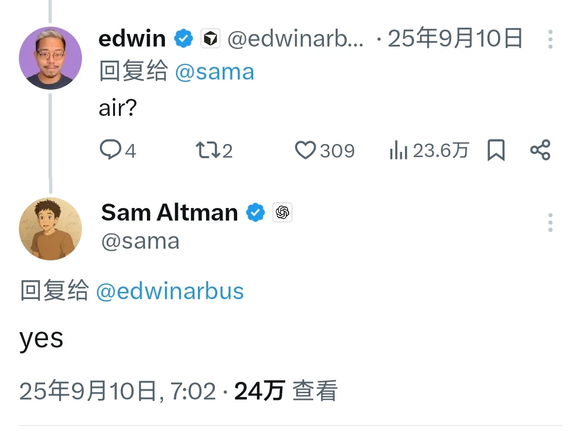 去年,他曾在社交媒体发文称,“好久没这么想升级到新款iPhone了,看起来很酷。”并在回复网友提问时确认,所指的就是iPhone Air。