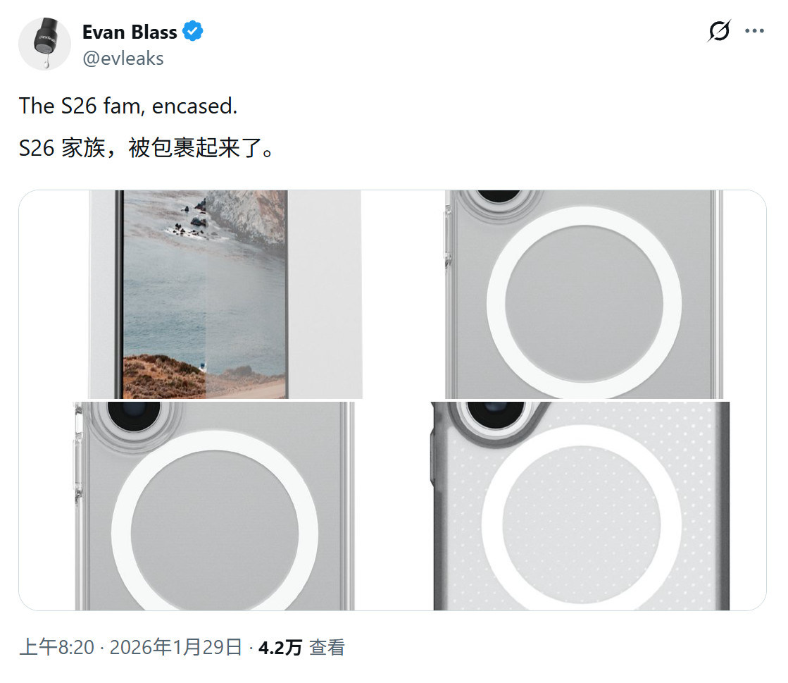 IT之家 1 月 29 日消息,消息源 @Evleaks 和 @MysteryLupin 今天(1 月 29 日)在 X 平台发布推文,分享了一组渲染图片,展示了适用于三星 Galaxy S26 系列的手机壳,确认圆润边角和药丸状相机凸起。