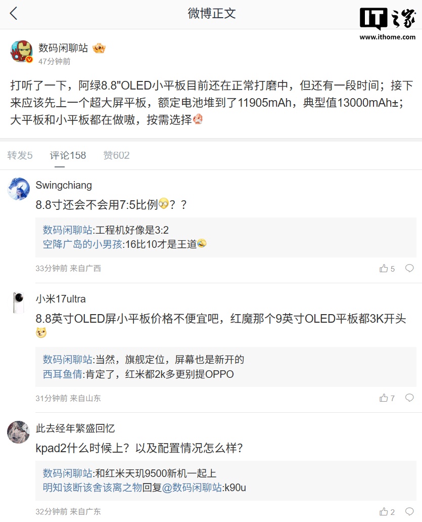 IT之家查询发现,该博主在 2025 年 10 月爆料称,“阿绿”厂正在打造 8.8 英寸 OLED 小平板,定位是“全能旗舰”,机身也很纤薄,但电池容量不算大。
