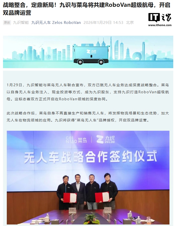 IT之家 1 月 29 日消息,今日,九识智能与菜鸟无人车联合宣布,双方已就无人车业务达成深度战略整合。菜鸟以自身无人车业务注入、现金投资等方式,成为九识股东,支持九识打造 RoboVan 超级航母。