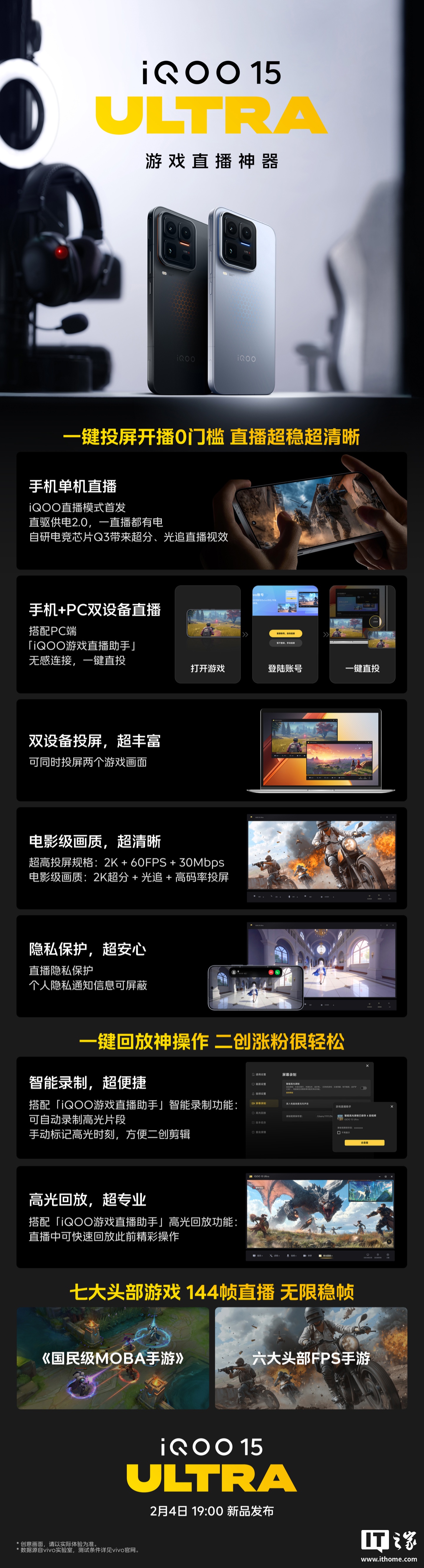 根据 iQOO 官方今日预热信息,iQOO 15 Ultra 还将主打「游戏直播神器」这一卖点,支持行业唯一「七大头部游戏 +144 帧直播 + 无限稳帧」、「iQOO 游戏直播助手」。