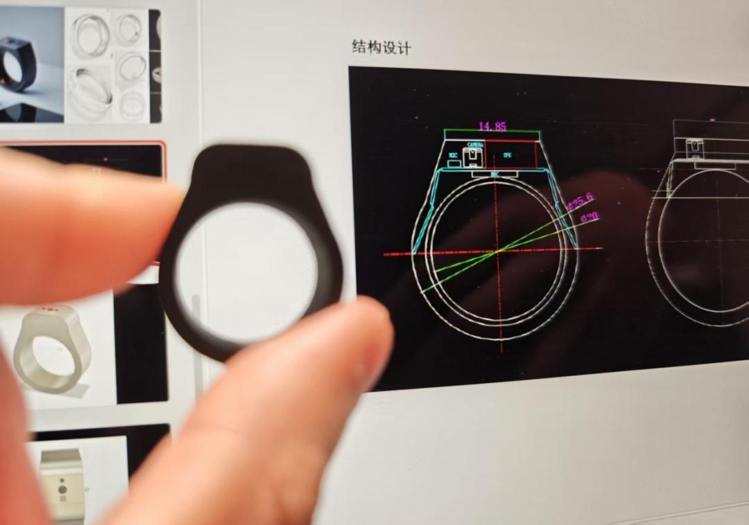 4个月后,我在深圳第二次见到唐畅。这次他捏着一枚小巧光滑的黑色陶瓷戒指,内壁透明,能看到里面的电路板,LED灯闪烁着。没了凸起的摄像头,跟当初的丑模型完全是两个东西。