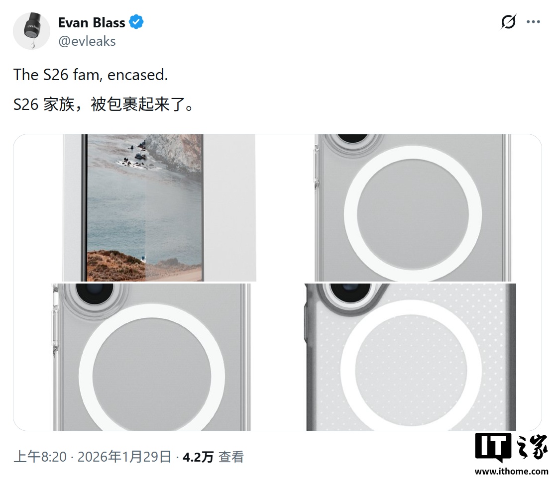 @Evan Blass 还曾分享了一组渲染图片,展示了适用于三星 Galaxy S26 系列的手机壳,确认圆润边角和药丸状相机凸起。