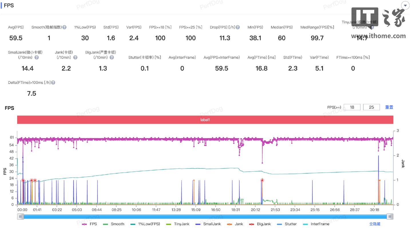 这是目前的“手机性能质检员”。在最吃性能的“黄金的时刻”地图进行 30 分钟跑图测试。实测平均帧率为 59.5FPS。
