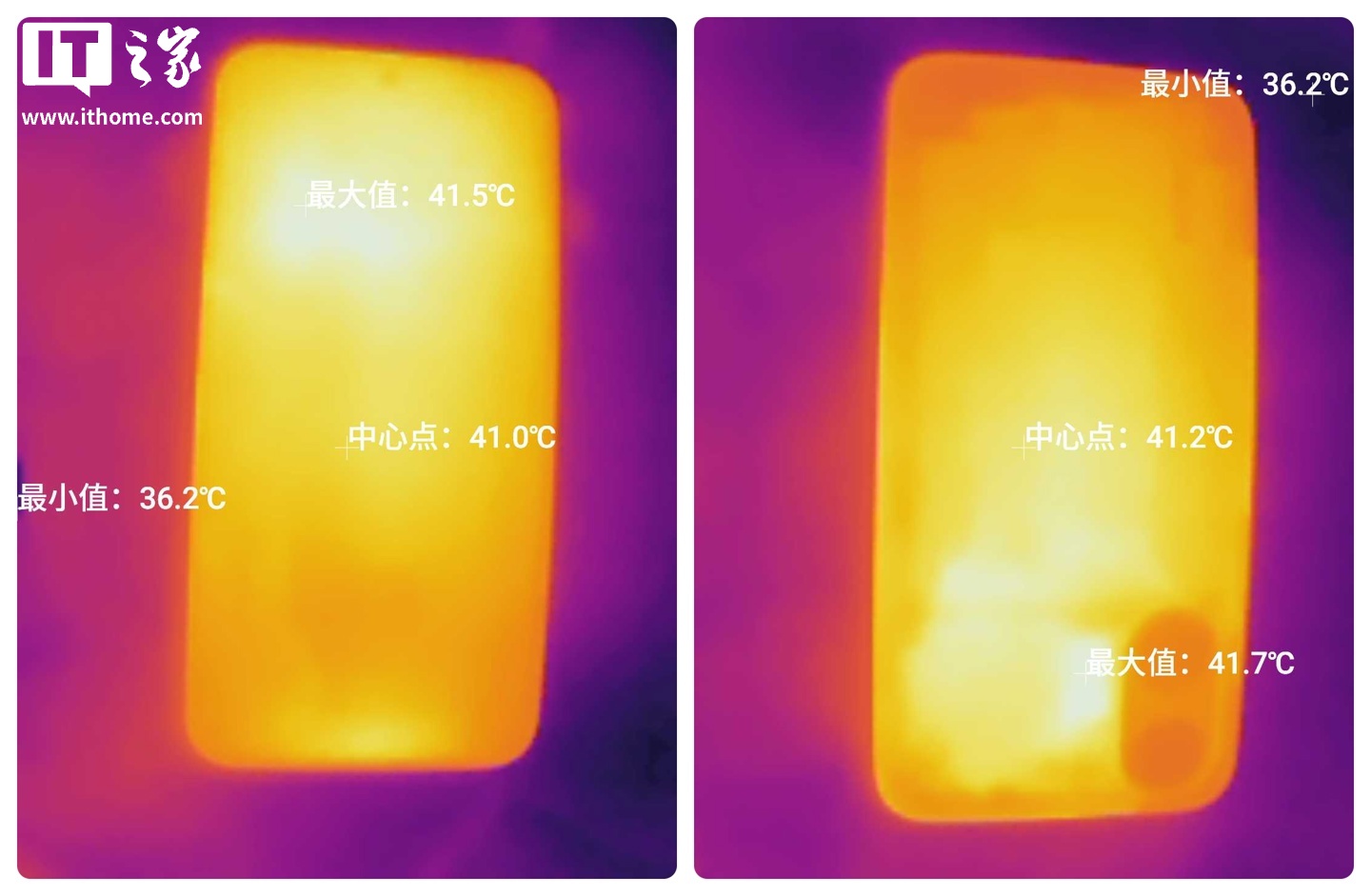 机身背部温度最高为 41.5℃,全新的 3D 循环冷泵确实发挥了作用,热量并没有在某一点堆积,而是均匀地散发到了机身背部。