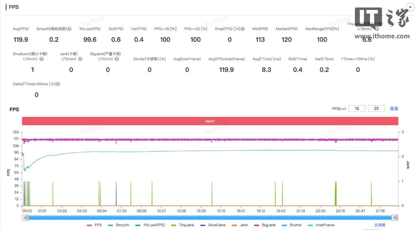 平均帧率 119.9FPS,帧率曲线平直如尺。