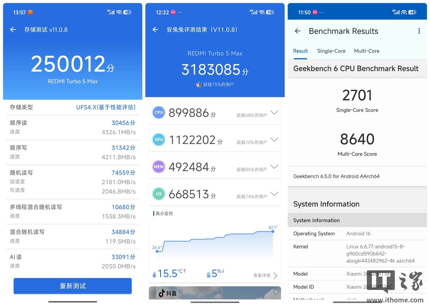 在理论性能测试环节,IT之家在室温 25℃ 的环境下进行了多轮跑分。