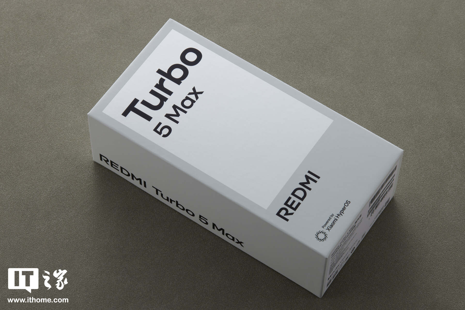 包装设计上,REDMI Turbo 5 Max 延续了前代经典的视觉语言,整体以银灰色为基调,辅以极简的图形元素与粗体文字排版,简洁且富有科技感。