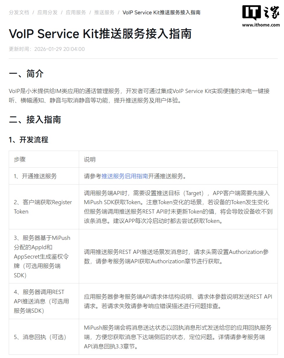 IT之家查询发现,VoIP Service Kit 推送服务接入指南显示,该功能可接入小米 MiPush 推送服务。