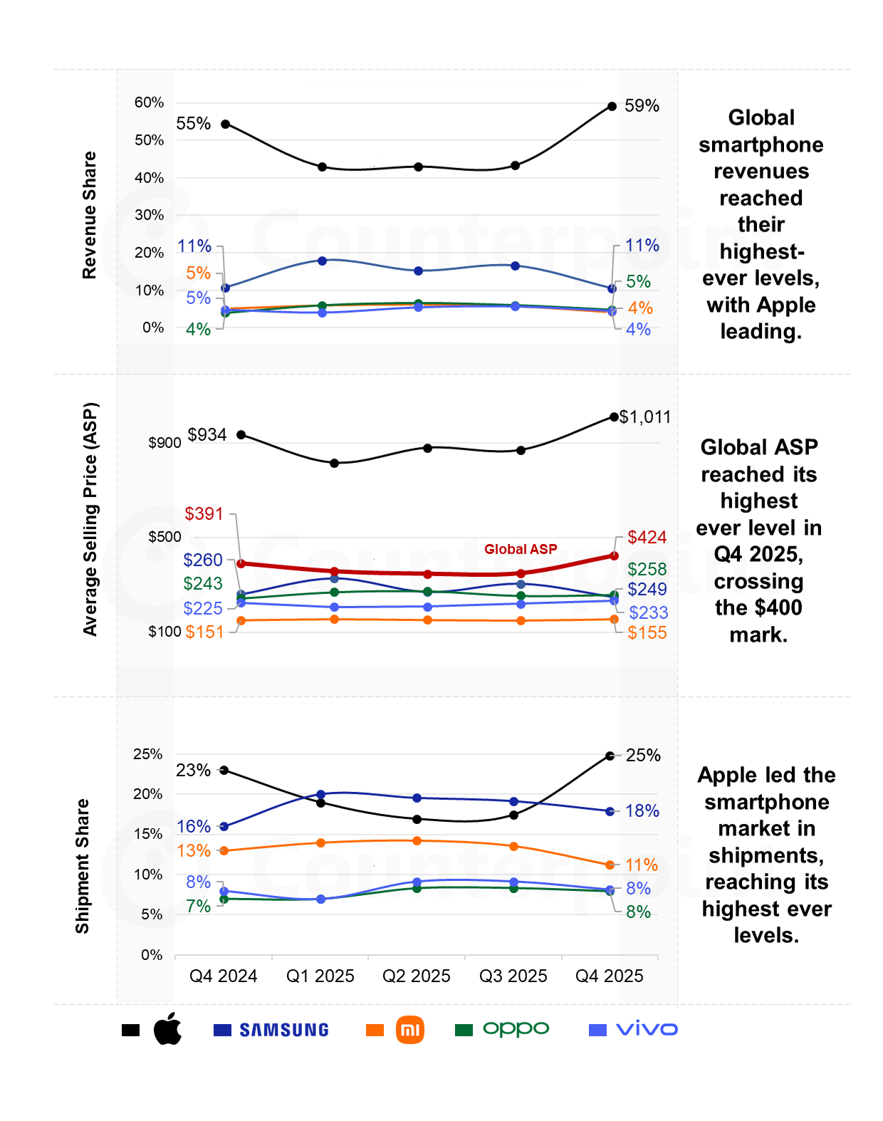 IT之家 1 月 30 日消息,今天下午,Counterpoint Research 发布的最新报告指出,2025 年第四季度全球智能手机市场收入同比增长 13%,达到 1430 亿美元,创下单季度新高。同一时期,手机高端化趋势加速,再加上物料成本上升,推动平均售价同比上涨 8%,季度首次突破 400 美元(IT之家注:现汇率约合 2781 元人民币)。相比之下,出货量仅同比增长 5%,说明市场扩张更多来自“卖得更贵”,而不是“卖得更多”。