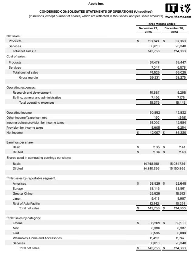苹果今日(1 月 30 日)公布了截至 2025 年 12 月 27 日的 2026 财年第一财季财务业绩。