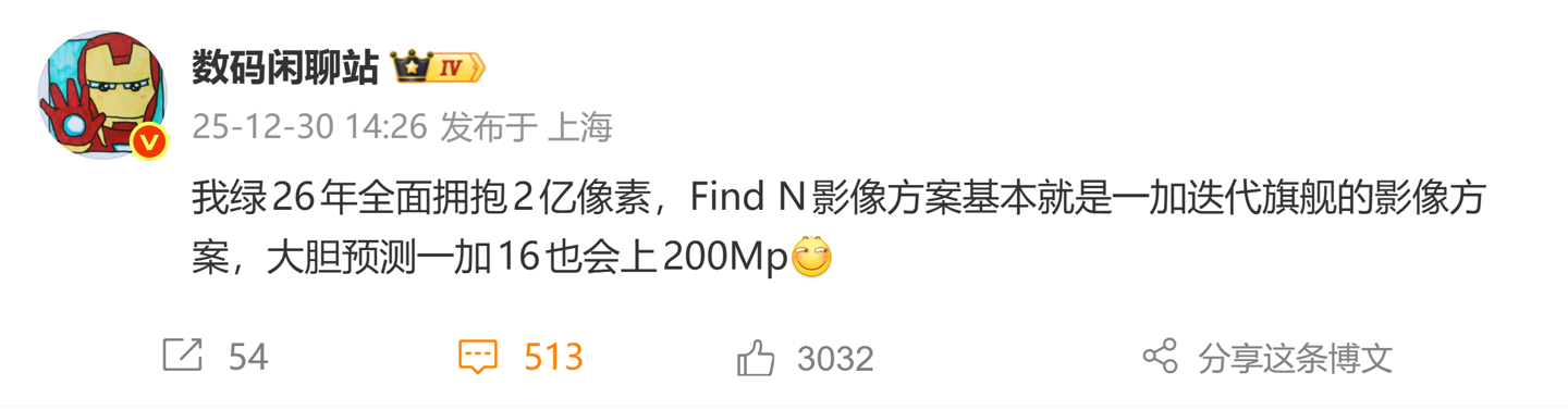值得注意的是,博主 @数码闲聊站 曾在去年末透露,绿厂 2026 年全面拥抱 2 亿像素,Find N 折叠屏手机影像方案就是一加迭代旗舰的影像方案,预测一加 16 也会上 2 亿像素 CMOS 传感器。