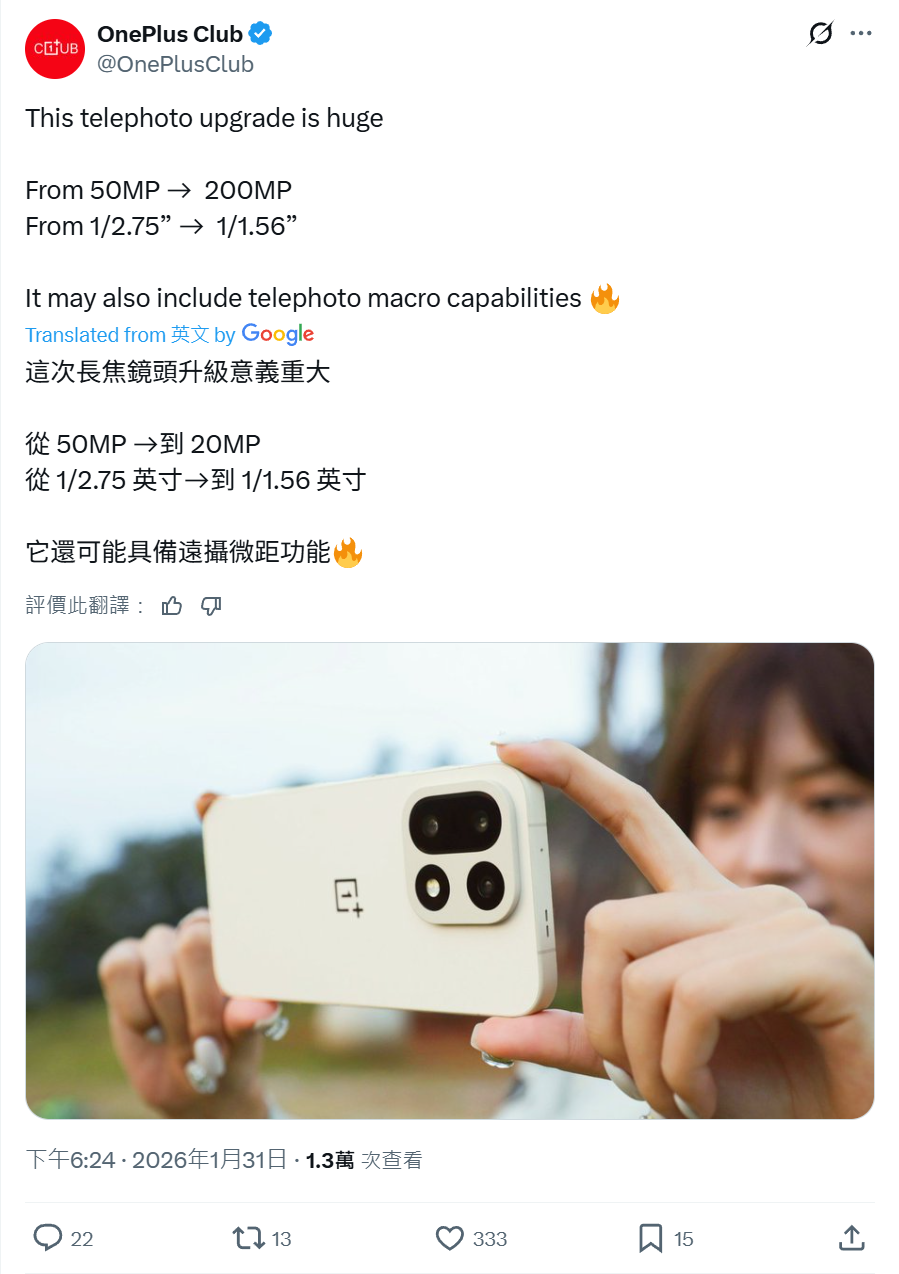 IT之家 2 月 1 日消息,消息源 OnePlus Club 昨天在 X 平台透露,一加 16 手机的长焦镜头将从 5000 万像素升级至 2 亿像素,CMOS 传感器大小则是从 1/2.75 英寸增大到 1/1.56 英寸,有望具备长焦微距功能。