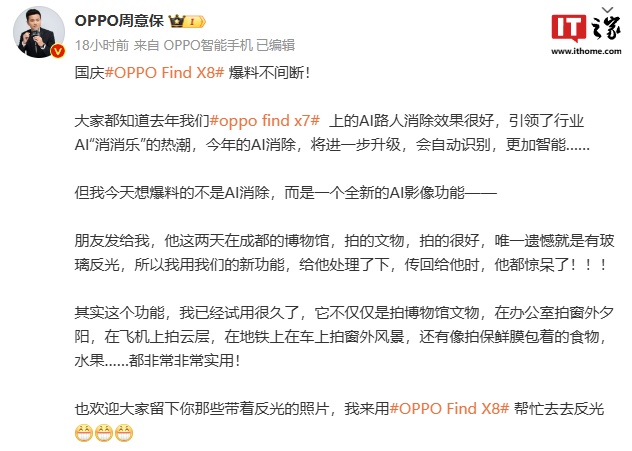 IT之家 10 月 4 日消息,OPPO Find 系列产品负责人周意保昨日(10 月 3 日)再次带来 Find X8 系列手机“爆料”,新品将支持 AI 去除照片反光功能,并公布演示图片。