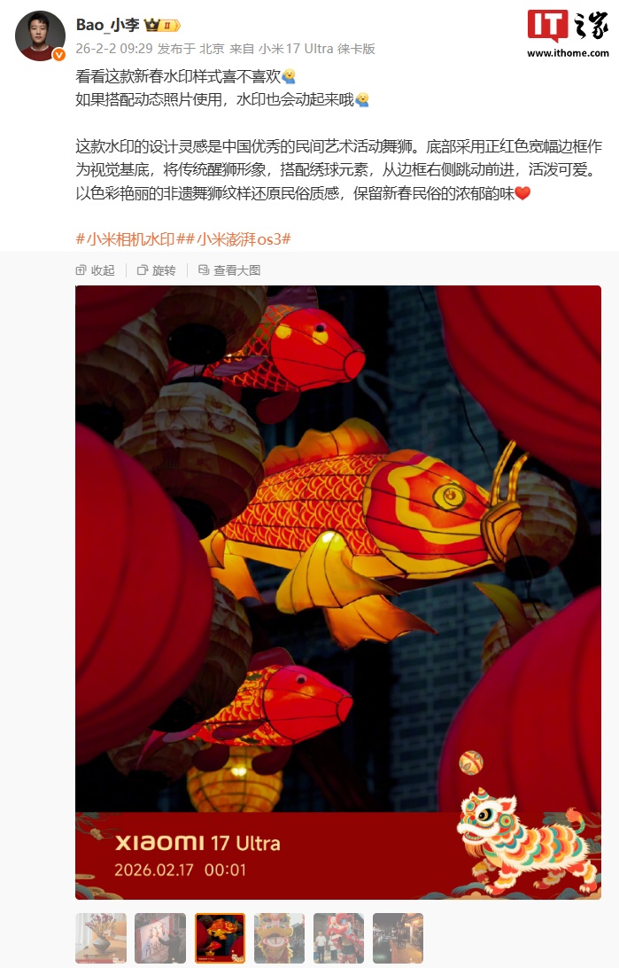 IT之家 2 月 2 日消息,小米相机部的产品经理 @Bao_小李 今日公布了小米 17 Ultra 的新春水印样式。据介绍,配动态照片使用,水印也会动起来。