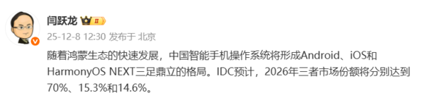 装机量的狂飙突进,直接转化为显著的市场影响力。根据国际数据公司(IDC)的报告,在2025年第四季度,HarmonyOS NEXT在中国智能手机操作系统市场的份额已达到12%。IDC此前更预测,到2026年,中国智能手机市场将正式形成Android、iOS和HarmonyOS NEXT“三足鼎立” 的格局,其中HarmonyOS NEXT的份额预计将达到14.6%。