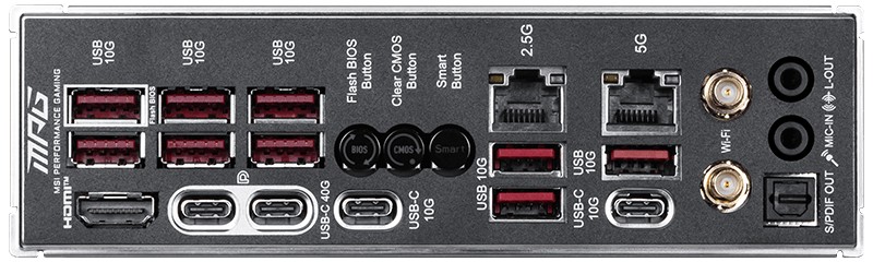 后部接口:2× USB-C 40Gbps、2× USB-C 10Gbps、9× USB-A 10Gbps、1× HDMI 2.1 FRL、1× 5GbE RJ45、1× 2.5GbE RJ45、一对 Wi-Fi 天线插孔、1× S/PDIF-out、2× 音频插孔。