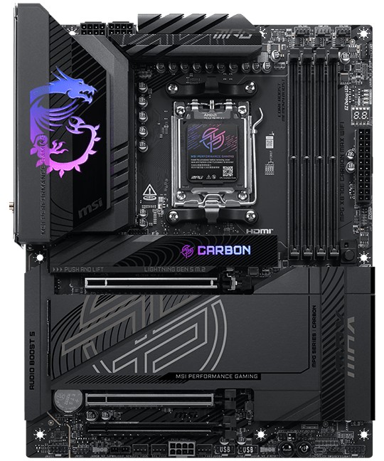 MPG X870E CARBON MAX WIFI 主板拥有碳纤设计,配备 Mysticlight RGB 灯效系统和光反射装甲。其基于 8 层 PCB,搭载 18(110A SPS) + 2 +1 相供电,拥有热管和大面积装甲等组成的散热系统。